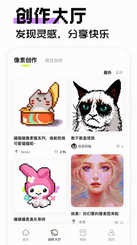 创作社区实行作品标签化管理系统,设有「像素插画」「游戏素材」「动态GIF」三大作品分区。每周举办的「主题创作赛」为优秀作品提供首页推荐位,创作者可通过作品打赏系统获得实质收益。