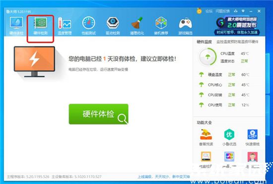 1、启动应用程序后,在功能导航栏选择「硬件检测」模块,该界面将自动加载设备基础信息;