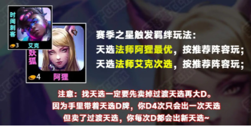 后期(6阶段后):4-2回合升8人口后,需进行阵容重构。重点追查法师天选单位,优先保证阿狸与艾克达到二星。约里克可根据对战情况替换为锤石增强控制链