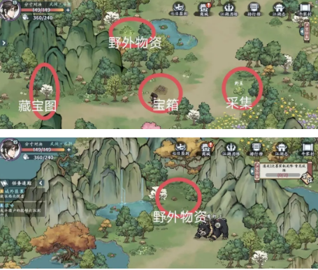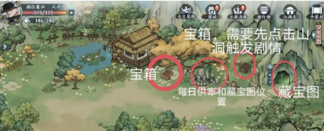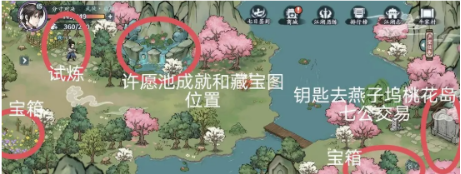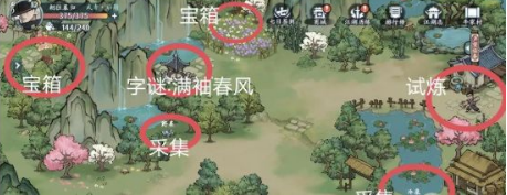 在村口石桥附近可发现两处宝箱(坐标X:127,Y:89),采集点位于老槐树(X:115,Y:102)与磨坊后院(X:142,Y:76)。特别提示:凉亭石碑处的文字谜题需输入「满袖春风」方可解锁机关。
