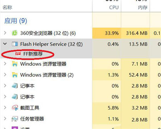 1、保持广告窗口开启状态,通过组合键Ctrl+Alt+Del调出任务管理器界面。在进程列表中定位到Flash Helper Service项目,展开子进程即可发现FF新推荐相关进程。