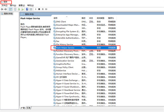 2、在服务列表中找到Flash Helper Service项目,双击进入属性配置面板。