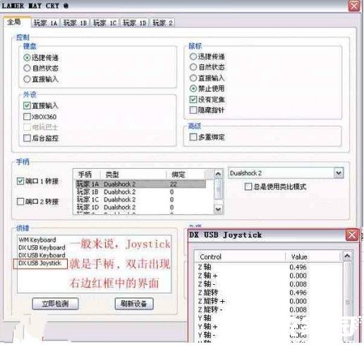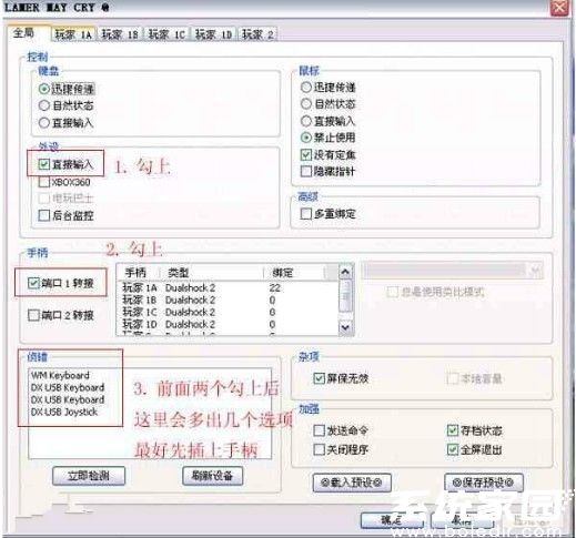 在设备管理界面勾选「外设-直接输入」选项,确保系统能正确识别物理控制器。端口设置区域选择「手柄-端口1连接」,此时状态栏应显示已接入设备型号。特别注意「总是使用类比模式」选项需保持未勾选状态,该设置主要适用于特殊游戏场景。