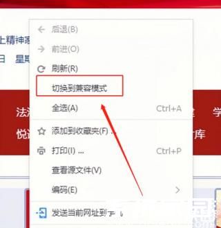 第二步:在展开的选项列表中选取「切换到兼容模式」功能项,系统将自动以兼容内核重新加载当前页面