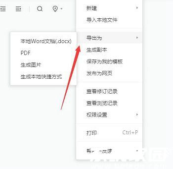 文档编辑界面右上方导航栏设有三横线标识,点击后展开功能菜单。将光标悬停在「导出为」选项时,系统会显示四种文档转换类型:本地Word文档、PDF文件、图片格式及快捷方式生成。每种格式对应不同使用场景,建议根据实际需求选择。