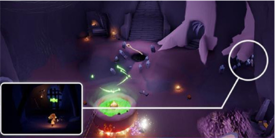 4、第四处需穿越魔法锅右侧的藤蔓长廊,进入木质拱门后沿旋转阶梯抵达顶端密室,此处为往年囚禁小陈的特定场景。
