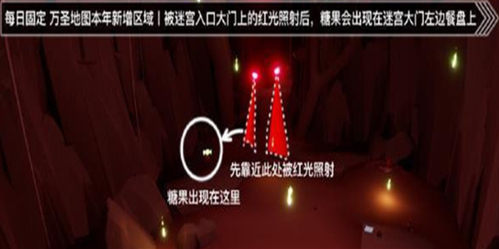 6、最终糖果刷新于新增的迷宫区域,当玩家激活入口处的猩红光柱后,需快速移动至大门左侧石台完成收集。