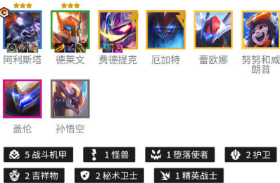 羁绊效果:激活5战斗机甲获得巨额双抗加成,搭配2护卫提升团队护甲,2吉祥物提供持续续航,1精英战士强化斩杀能力,1堕落使者增强控场效果,2秘术卫士提高魔法抗性。