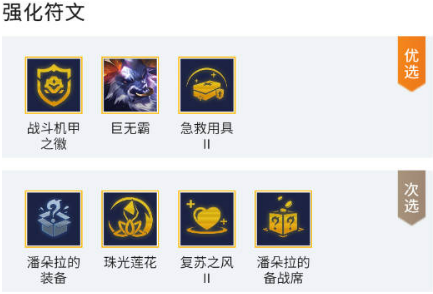 优先选择战斗机甲之徽直接提升核心羁绊等级,阿利斯塔专属强化「巨无霸」可显著增强生存能力。急救用具II能提升全队治疗效果,次选潘多拉装备保证关键装备成型,珠光莲花强化技能暴击,复苏之风II在残局阶段效果显著。