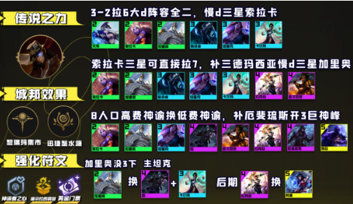 运营要点提示:2阶段优先合成索拉卡核心装备,3-2阶段升至6人口启动阵容雏形。利用潘朵拉装备特性确保关键装完美成型,中期通过黄金门票加速三星索拉卡的获取。后期可根据对手阵容灵活调整站位,确保加里奥吸引主要火力,为后排创造输出环境。