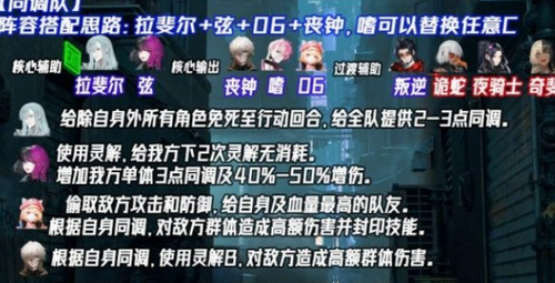 拉斐尔作为体系运转枢纽,群体附加2-3层同调效果,特殊机制可使队友在获得同调时概率触发免死效果。需注意当拉斐尔完成5次同调叠加后,首回合即可达成9层满同调状态。