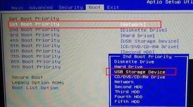 5.在Boot Priority列表中将USB Storage设为第一启动项