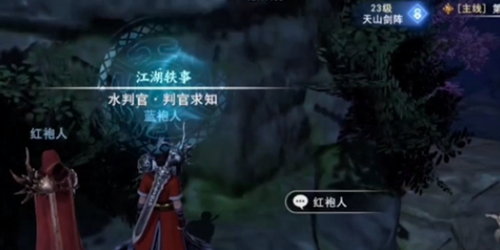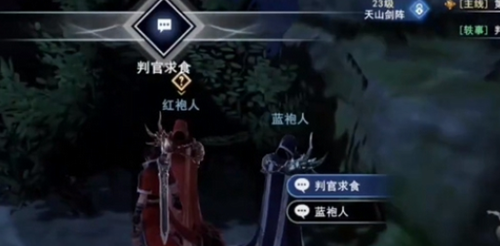悬崖边缘矗立的朱袍判官与蓝衫文士构成特殊交互组合。建议优先与佩戴青铜面具的朱袍NPC对话,该角色头顶会出现菱形任务标识。选择对话分支中的「饥肠辘辘」选项,将激活「判官求食」支线剧情。