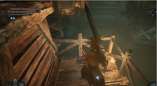 4.激活机关后产生的机械震动会导致地面塌陷,此时需把握跳跃时机。建议切换至轻甲装备提升移动速度,在机关完全启动3秒后向前冲刺跳跃,可精准落在下方安全平台。
