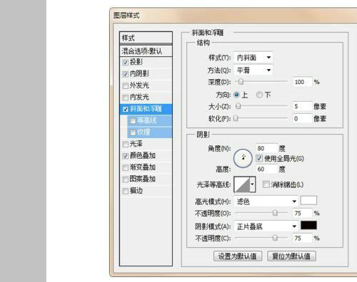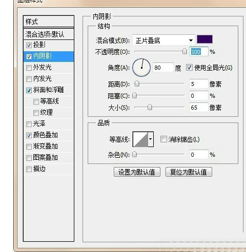 - 内阴影:混合模式正片叠底,不透明度75%,角度120度,距离8像素,阻塞15%,大小12像素